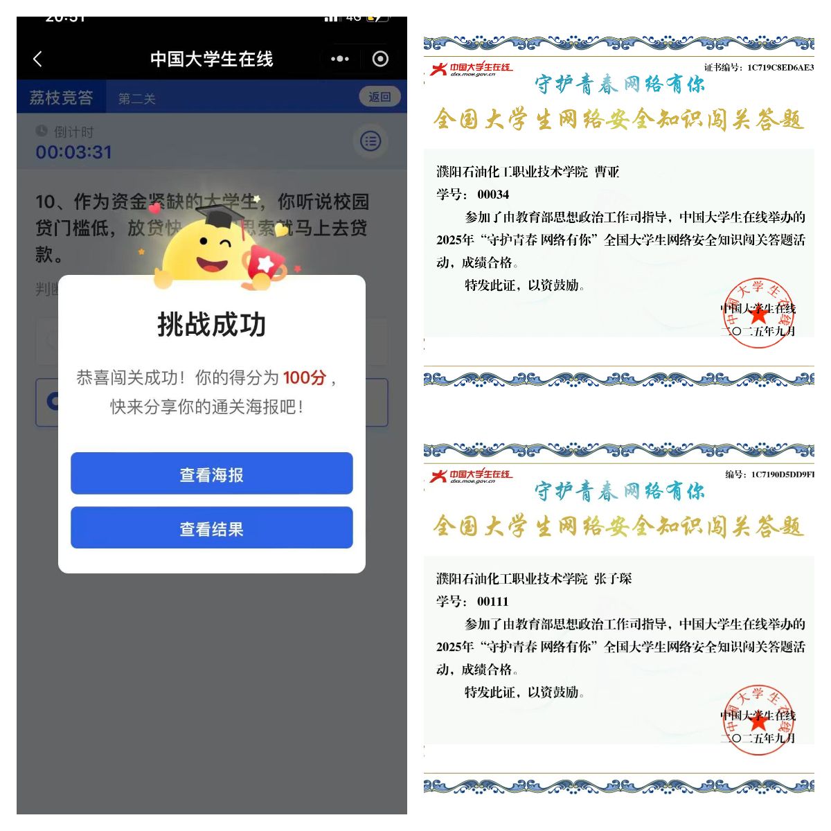为了提升网络安全宣传效果,学院2025年9月15日—9月26日组织组织全校师生开展了河南省网络安全知识答题活动。全校师生参加中国大学生在线举办的“守护青春网络有你”全国大学生网络安全知识答题活动,通过线上答题提高大学生防范网络诈骗、安全使用网络的能力。