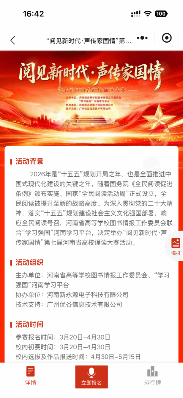 2026年是“十五五”规划开局之年,也是全面推进中国式现代化建设的关键之年。随着国务院《全民阅读促进条例》颁布实施、国家“全民阅读活动周”正式设立,全民阅读被提升至新的战略高度。为深入贯彻党的二十大精神,落实“十五五”规划建设社会主义文化强国部署,响应全民阅读号召,河南省高等学校图书情报工作委员会联合“学习强国”河南学习平台,决定举办“阅见新时代·声传家国情”第七届诵读大赛活动。