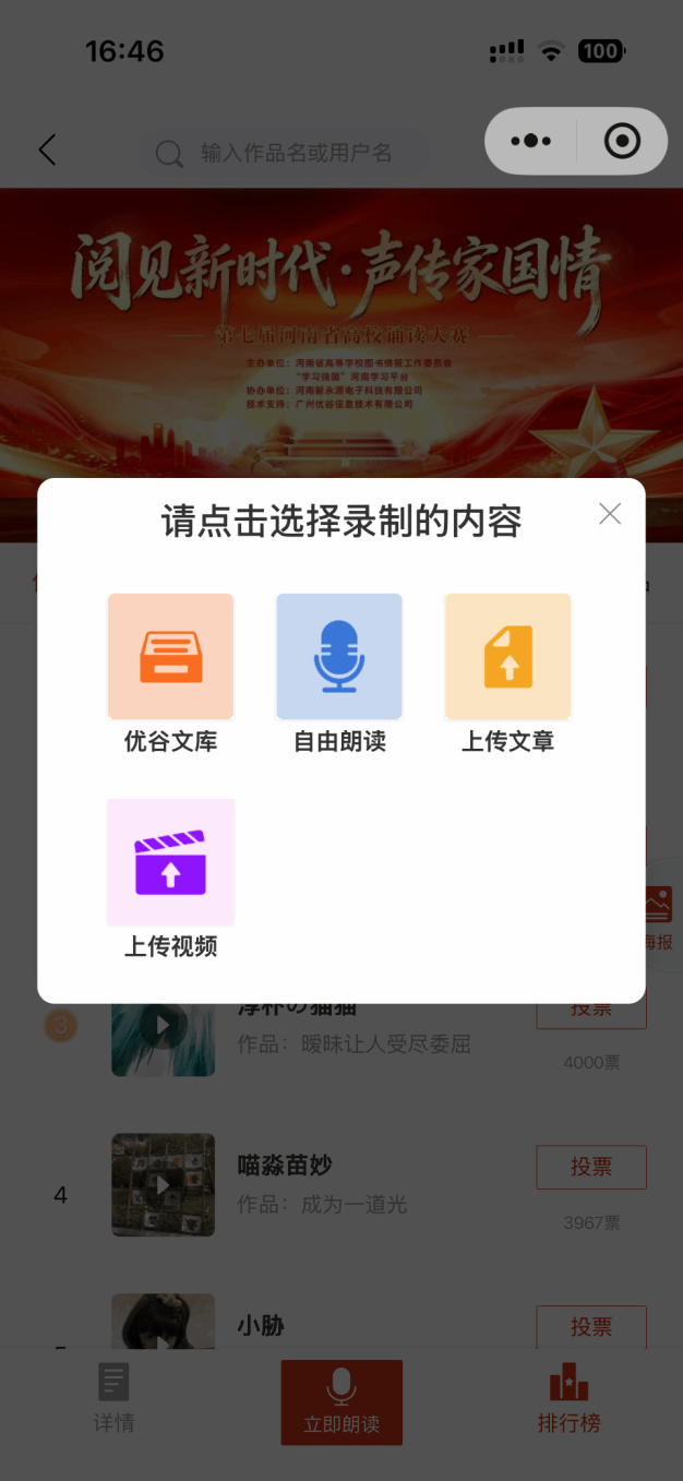 3. 报名信息填写后,即可进入作品录制及提交,参赛选手可围绕“阅见新时代·声传家国情”主题诵读大赛主题,结合主题关键词在“学习强国”“优谷文库”选择合适的素材,搭配配乐进行创作(录制前在右下角“更换”选择自己喜欢的配乐);