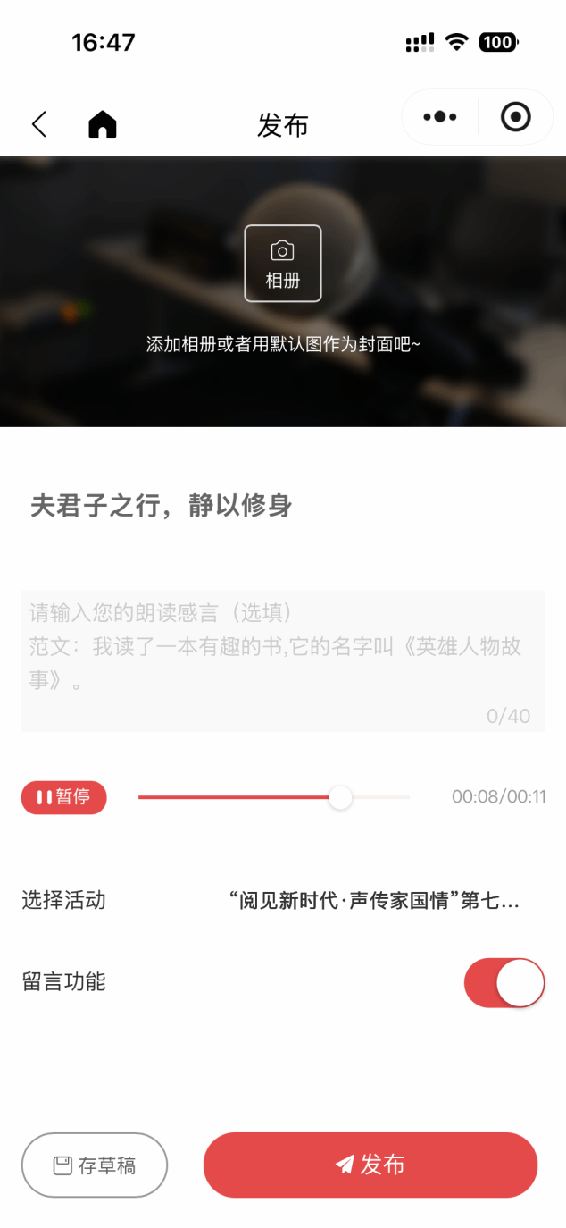 4.诵读完成后,点击“完成”,点击相册添加喜欢的图片或使用默认图做封面,在“选择活动”处确认提交至第七届河南省高校“阅见新时代·声传家国情”主题诵读大赛,点击“发布”,即作品提交参赛成功。