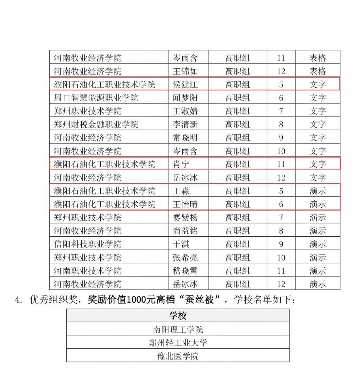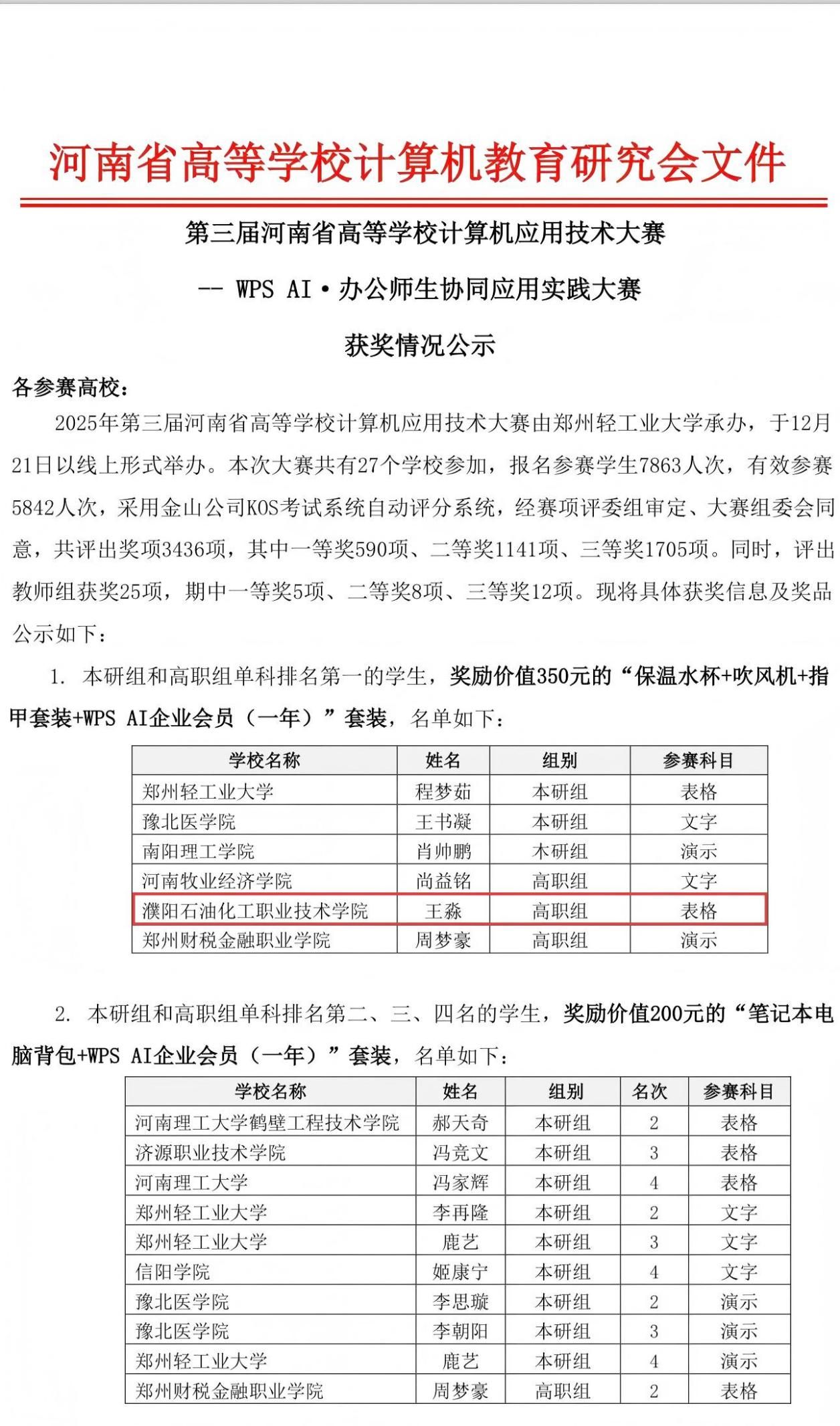 近日,由郑州轻工业大学承办的2025年第三届河南省高等学校计算机应用技术大赛圆满落下帷幕。我校积极组织学生参与此次大赛,经过激烈角逐,我校参赛学生凭借扎实的计算机应用技能和出色的发挥,在大赛中全部获得奖项,其中更有学生在单项比赛中勇夺第一名,为学校争得了荣誉。