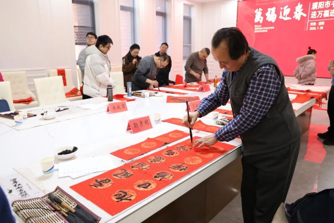 活动现场,墨香四溢,其乐融融。苏献康、靳彦明、朱国勇、孟艳丽、南献省、刘卫民、许亚彪、牛兵等濮阳实力雄厚的艺术名家,笔走龙蛇,挥毫泼墨,一个个遒劲的“福”字和一副副寓意吉祥的春联跃然纸上。楷书端庄工整,行书飘逸灵动,隶书古朴厚重,不同书体各展神韵,引得在场师生纷纷驻足观赏。大家或围在书法家身旁,仔细观摩他们运笔的技巧,感受笔墨在纸张上舞动的韵律;或轻声交流着对不同书体的理解和喜好。现场气氛热烈而融洽,充满了浓浓的年味和文化气息。