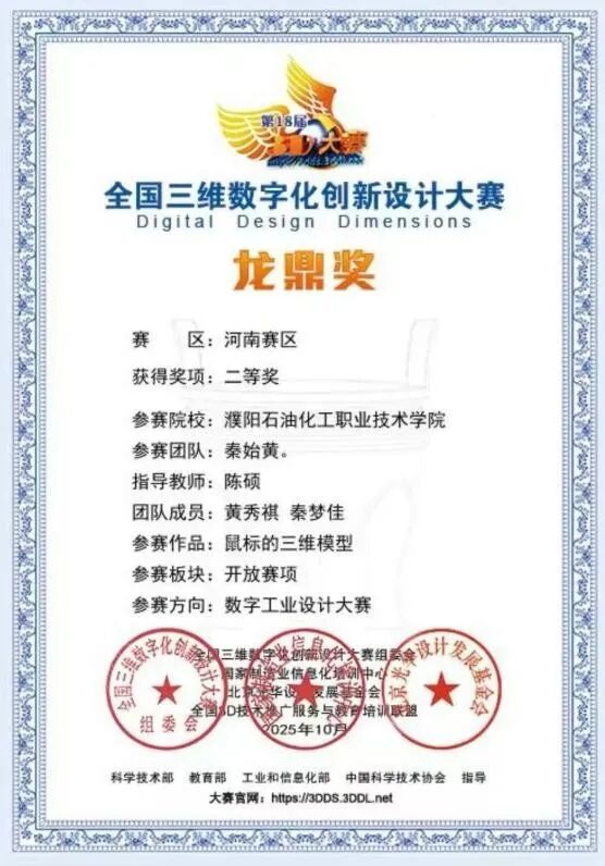 全国三维数字化创新设计大赛(简称“3D大赛”)是全国普通高校大学生竞赛排行榜的重要赛事,紧密对接国家创新驱动发展战略与数字经济发展需求,已成为全国规模最大、规格最高、水平最强、影响最广的“互联网+创新”行业盛会,被业界称为“创客嘉年华、3D奥林匹克、创新设计奥斯卡”。本届大赛以“数智融合、创见未来”为主题,吸引了全国众多高校学子同台竞技,竞争异常激烈。石化学子凭借卓越的创新思维、扎实的专业技能和默契的团队协作,在全省众多参赛队伍中脱颖而出,荣获6个奖项,其中机电学院学子张慧珉、罗斌团队获河南省特等奖,黄秀祺、秦梦佳团队获二等奖,符博涵等团队获三等奖,此次获奖彰显了学校在数字化设计与智能制造领域的人才培养实力。