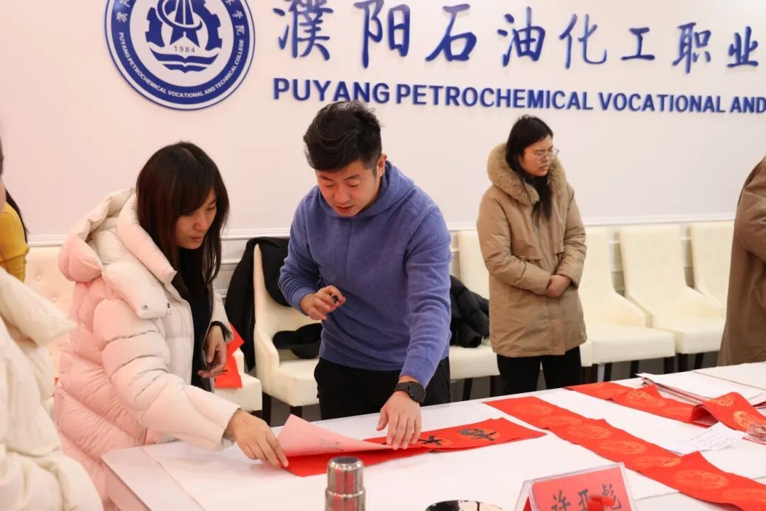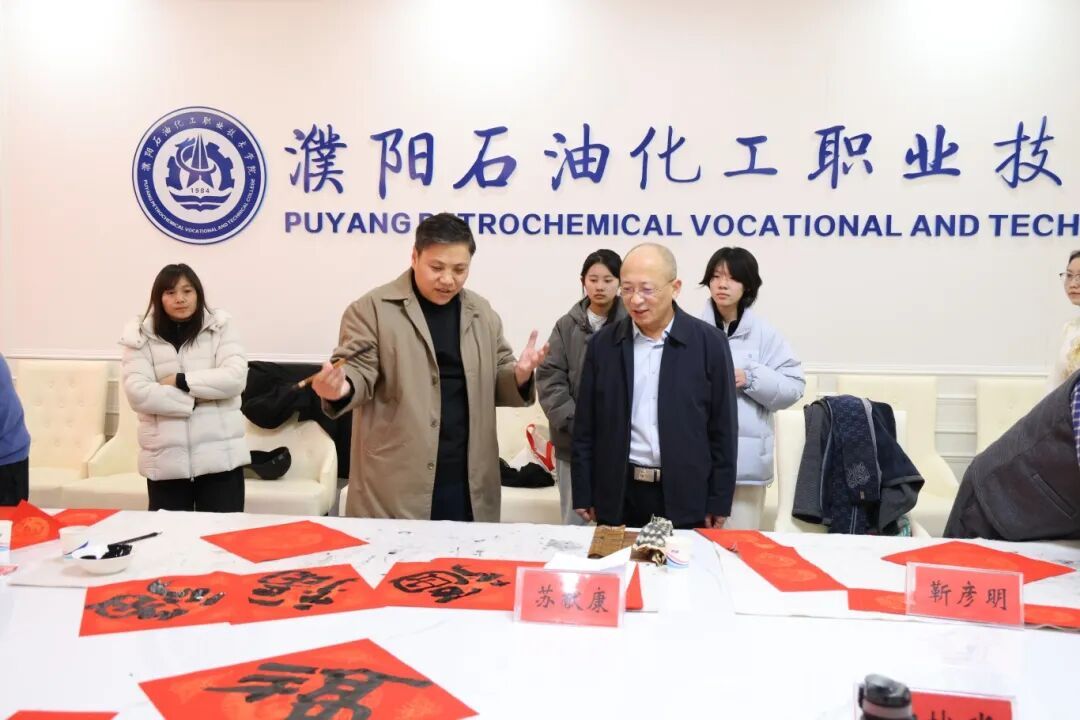 1月28日下午,由濮阳市书法家协会、濮阳石油化工职业技术学院联合举办的“万福迎春——濮阳市书法家协会送万福进万家公益活动”在我校图书馆对外交流室举行。十余名书法名家齐聚校园,以笔为媒,以墨为介,为师生现场书写新春联,送上新年的美好祝福。